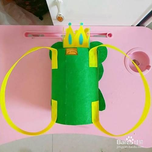 黄色不织布剪出青蛙的皇冠和背带,分别粘好