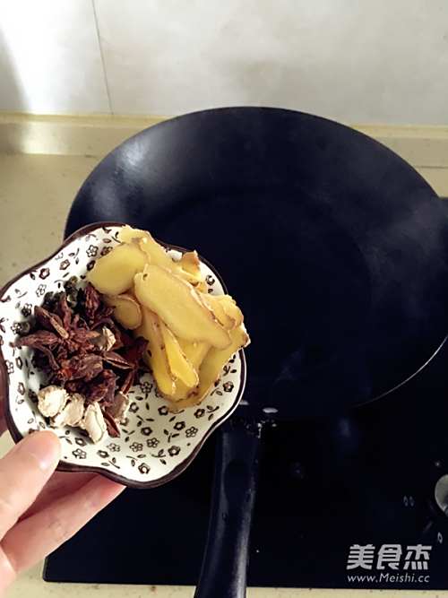 2锅中倒入油,油开倒入姜、八角、山奈、花椒炒出香味
