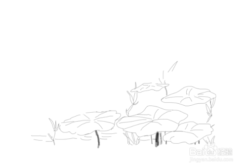 再在荷叶的下面画出水波纹,然后在画出水里面的水草及叶子的茎部,如图所示: