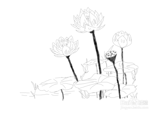 最后我们再画出荷花的另一朵盛开的荷花,这样我们的中国画荷花就画好了,如图所示: