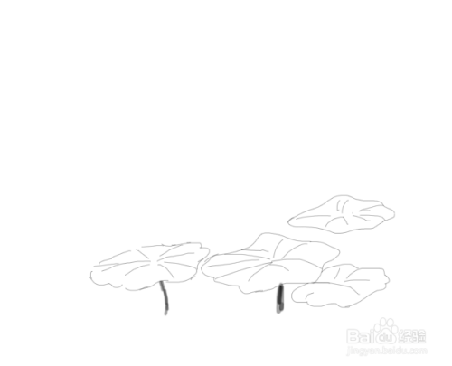 再在这片叶子的右侧再画出三片荷叶并在画出叶脉及叶子的茎部,如图所示: