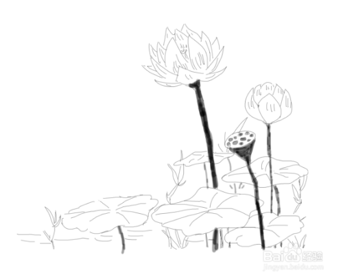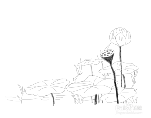 再在右侧的荷花的旁边再画出荷花的果子,并在画出荷花的果子的茎部,如图所示: