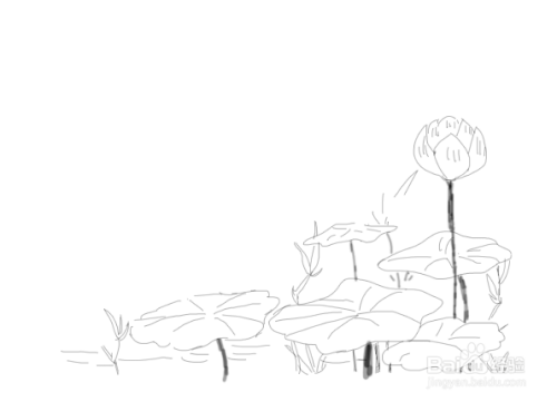 再在右侧的荷叶的基础上再画出荷叶的一朵盛开的荷花,然后再画出荷花的花茎,如图所示: