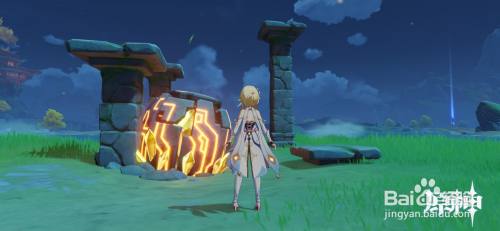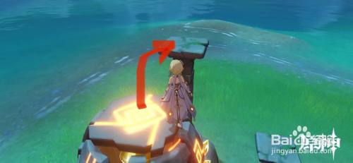选择岩主,点击使用E元素技能在三个石柱间召唤岩柱子,爬上岩柱子跳到其中一个平台上。
