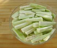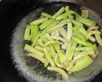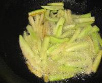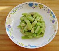 茄子去皮,中间切断后切细长条,用水泡着,以免发黑。