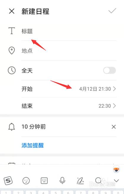 进入新建日程,给事项添加标题,并且设置提醒的时间。
