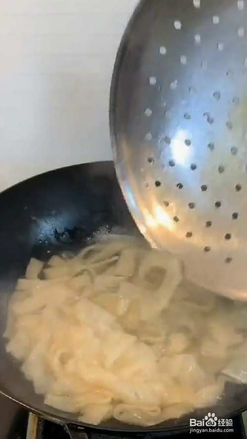 锅中烧水,水开下宽粉煮熟,煮熟之后倒入冷水中浸泡。