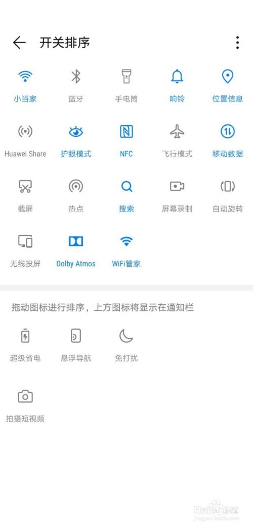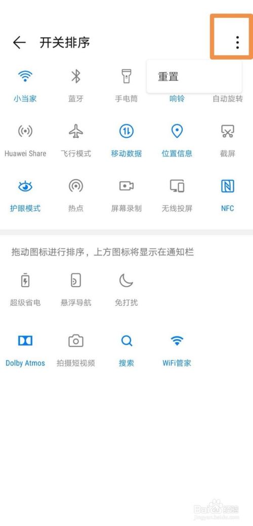 进入界面后就可以给图标排序,点击右上方的三个竖点就可以重新修改重置通知栏里的功能啦