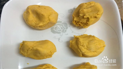 面团揉好之后,分成等额大小的小块,这个有助于做出大小一致的南瓜饼,然后拿起一个面团,挖出一个漏斗状,放入红豆沙,合口,揉成小圆团。