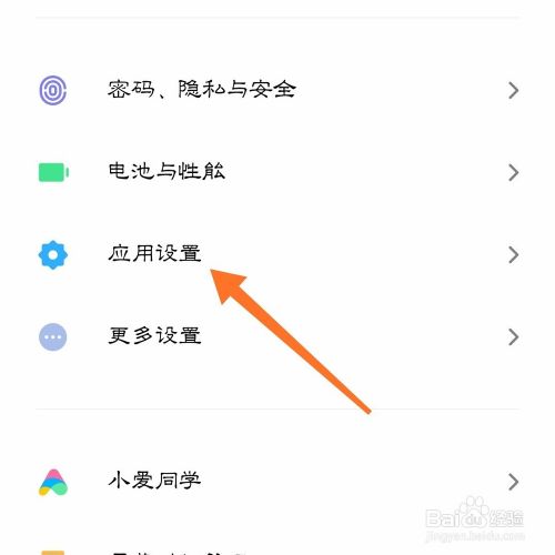 进入设置之后呢,我们首先会看到许多选项,我们找到第四栏,里面有:密码隐私与安全、电池与性能、应用设置等。我们找到【应用设置】哦。点击进入就可以了