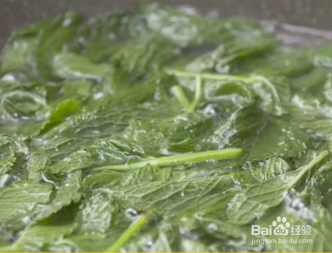 薄荷叶洗净, 吸干水分,热油锅,薄荷叶小伙低温炸,炸至变软捞出。