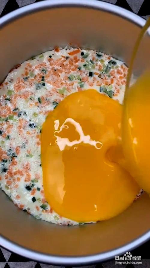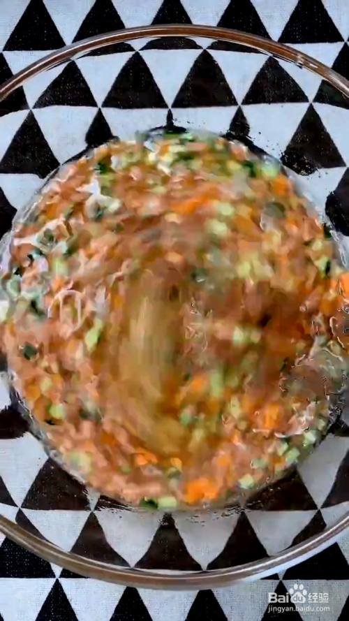 碗中打入一个鸡蛋,蛋清蛋黄分离,蛋清中加入黄瓜丁、火腿丁、胡萝卜丁,然后加盐和鸡精等调味品,搅拌均匀。