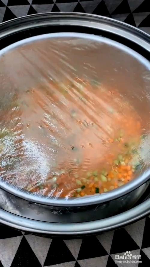 将蛋清混合物放倒入锅中,盖上保鲜膜,扎上几个洞,水开蒸15分钟。