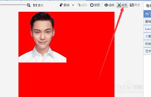 最后我们在裁剪一下尺寸,图片处理最上面右侧可以看到一个裁剪选项,点击选择进入到裁剪操作对话框,根据需要进行裁剪即可。好了更换背景颜色就完成了。