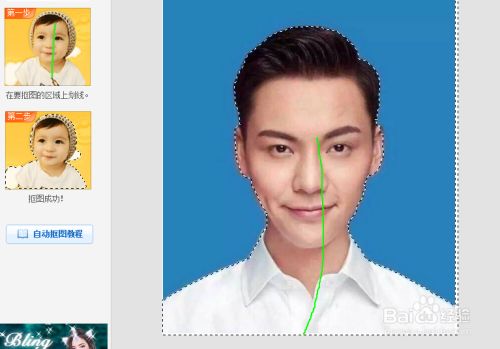 选择好抠图样式之后,接下来会进入到抠图的对话框,自动抠图只需要使用鼠标在人物区域划上那么一道,接下来就可以看到一圈虚线就会把人像圈起来,即要抠出的部分。需要注意的是划的那一道需要把头部和上半身区域都包括,不要只划头部,那样就会只抠头部了。