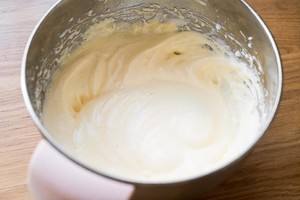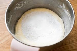 低筋面粉和糯米粉提前混合均匀,过筛一半的粉量至步骤3中。