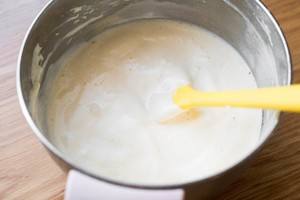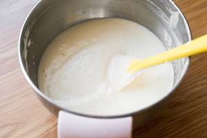 玉米油和牛奶加一点盐(可不加)混合均匀,沿着刮刀倒入盆中。