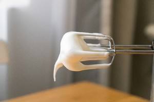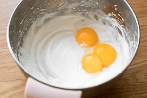 鸡蛋的蛋黄和蛋清分离,分别装入无水无油干净的盆中。蛋清+细砂糖,用电动打蛋器打发至接近硬性发泡。