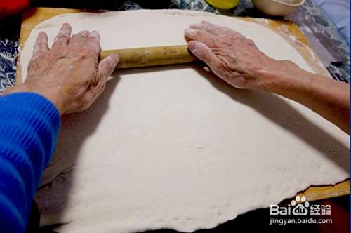 把一半面放在案板上赶成一大张饼状(薄厚根据自己口感掌握),均匀撒上食用盐(根据自己口味掌握放盐量)