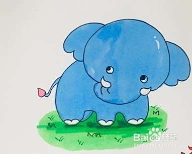然后是涂色啦,给大象的身子涂上蓝色,身下的草地涂上绿色,可爱的大象简笔画就完成啦!