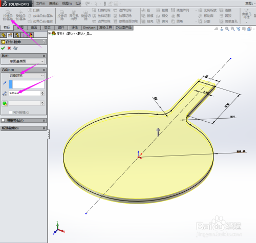 然后在特征中选择拉伸工具,设置好拉伸方向和距离,如下图所示。