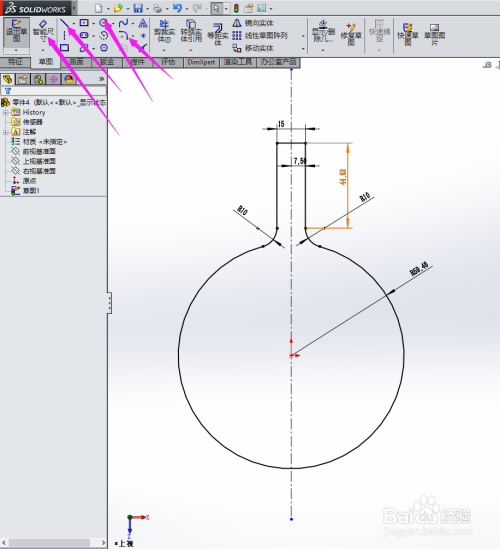 然后选择草图绘制工具,如下图,然后标上尺寸。