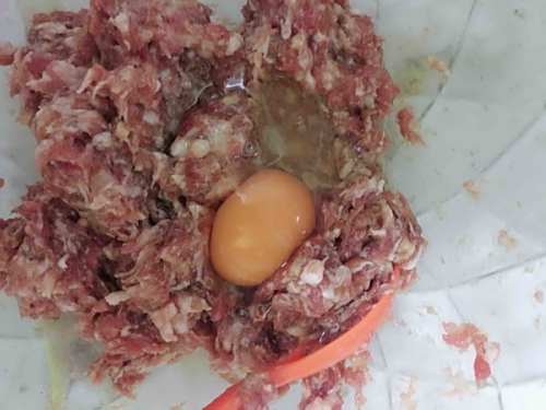 将炒好的鸡蛋、韭黄、虾仁放入调好的肉馅中。