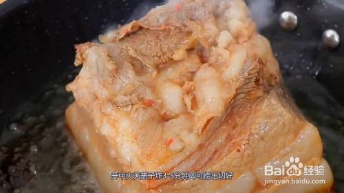 起锅烧油,油温四成热后放入事先腌制好的五花肉,开中火关盖子炸3-5分钟即可捞出切好,并腌制备用。