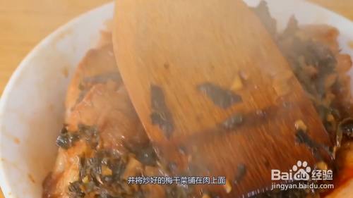 将炒好的梅干菜铺在炸好的五花肉上,蒸煮半个小时左右,起锅后倒出汤汁,倒扣在盘上即可食用。