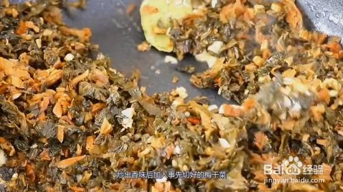 锅内留底油,放入蒜末,香叶、八角,炒出香味后加入事先切好的梅干菜,淋上腌肉的酱汁进去,炒出香味后出锅。