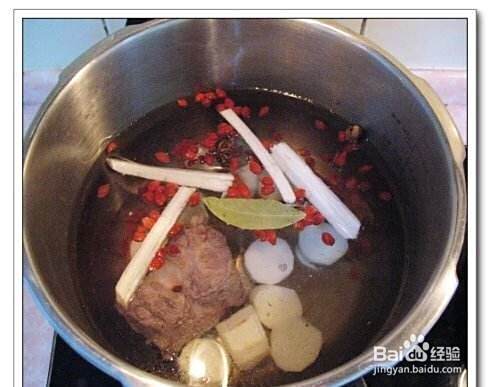把洗好的牛尾巴骨放进高压锅里 放入黄酒 生姜 葱白 然后加上水 要没过牛尾巴骨 开大火 进行炖煮
