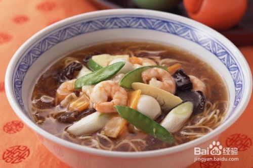 旺火、沸水煮熟面条,沥水后,分装入10只碗内,再浇上虾仁清汤即成。
