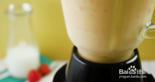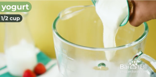 加入酸奶。原味酸奶给冰沙如奶油般绵密柔滑的口感,可以很好地衬托草莓的甜味,不会喧宾夺主。你也可以根据自己的喜好,加一点冰淇淋和(或)草莓汁。