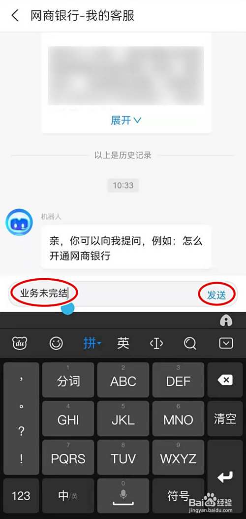 进入提问页面,在输入框输入业务未完结,点击发送获取处理办法;