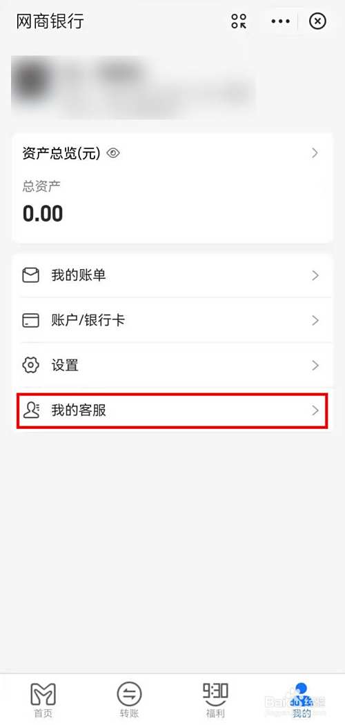 进入支付宝网商银行小程序我的页面,内容简洁,点击我的客服;