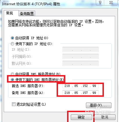 勾选使用下面的DNS服务器地址选项,输入当地宽带运营商提供的首选和备用DNS服务器地址然后点击确定按钮即可。