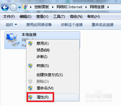 在网络连接界面,鼠标右键本地连接图标选择属性进入。