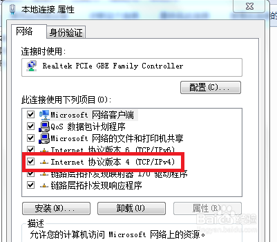 在弹出的本地连接属性对话框,双击Internet 协议版本4(TCP/IPv4)进入 。