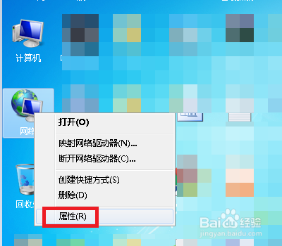 在操作系统桌面上,鼠标右键网络图标选择属性选项进入。