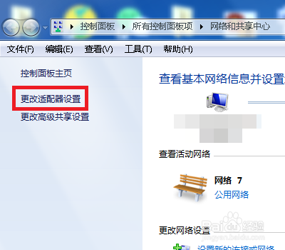 进入网络和共享中心界面,点击左侧更改适配器设置进入。