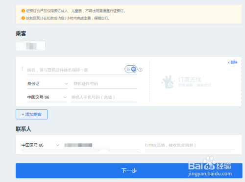 第四步:这个时候马上就会出现让我们输入乘车人的信息,我们输入我们的个人信息,然后把我们的个人信息和联系方式输入进入,点击下一步。