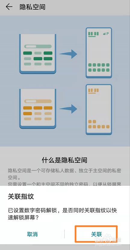 ③输入主空间密码,设置隐私空间密码,确认密码,点击【关联】即可完成操作。