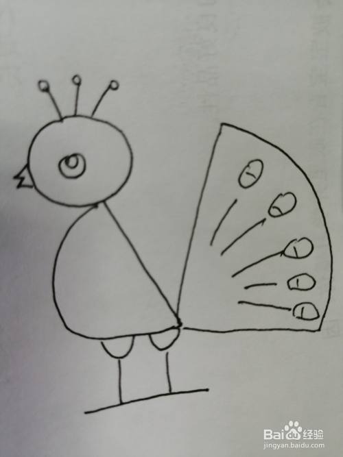 第七步,最后把简笔画小孔雀的尾巴上的花纹画出来。简笔画小孔雀就画好了。