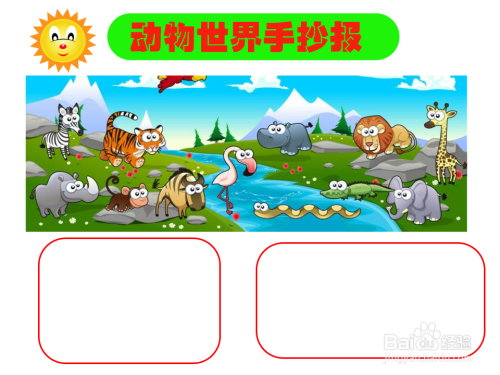 接着在空白的位置画2个不同大小的文本框,并书写上和“动物世界手抄报 ”相关的文字信息。