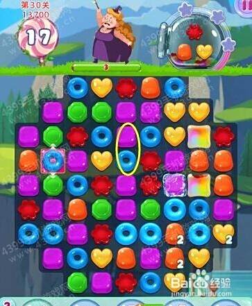 2.打法跟第6关一样,只要消除橙、黄、蓝三色糖果来击败胖女巫就可以了