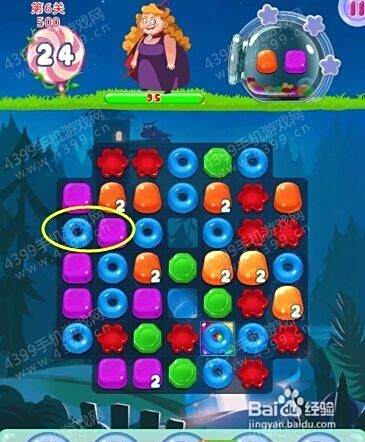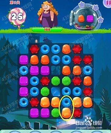 1.先把最下方的橙蓝两色糖果互换(如下图),可以消掉5个橙色糖果,对女巫造成5点伤害值。