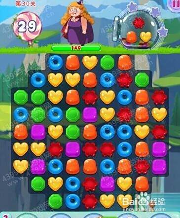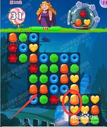 1.通过消除红、橙、黄三色糖果来击败胖女巫(生命值110)31步