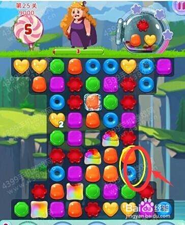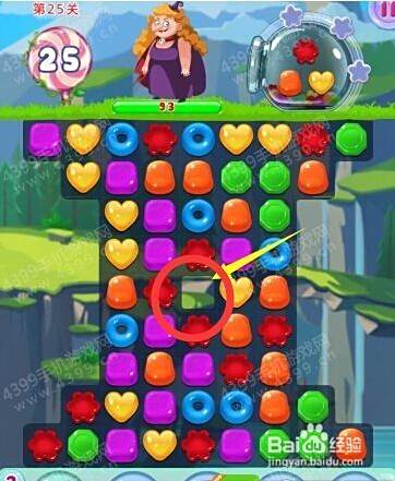 1.通过消除红、橙、黄三色糖果来击败胖女巫(生命值93)25步。