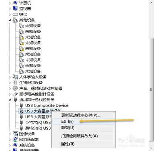 如果USB接口插入鼠标键盘可以正常使用,在插入U盘后有提示音却没有新的磁盘显示的话,我们可以右键点击“我的电脑——管理——设备管理器——通用串行总线控制器——启用USB大容量存储设备”。如下图所示: