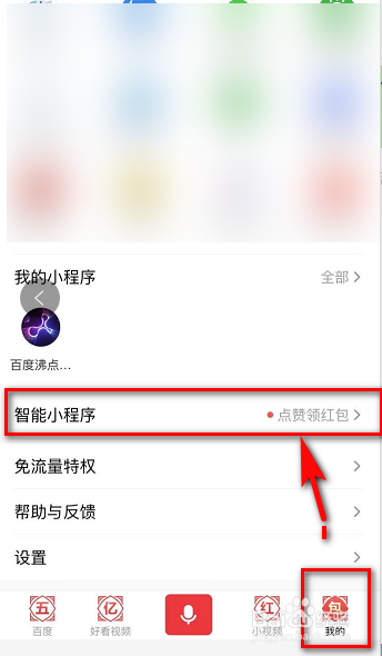 1. 打开百度App首页,点击底部右下【我的】,并点击我的小程序下的【智能小程序点赞领红包】。